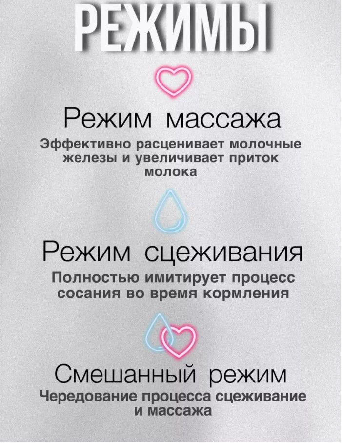 Портативный и мощный молокосборник имеет 3 фазы работы: Массаж, Сцеживание и Смешанный режим для самой чувствительной груди.